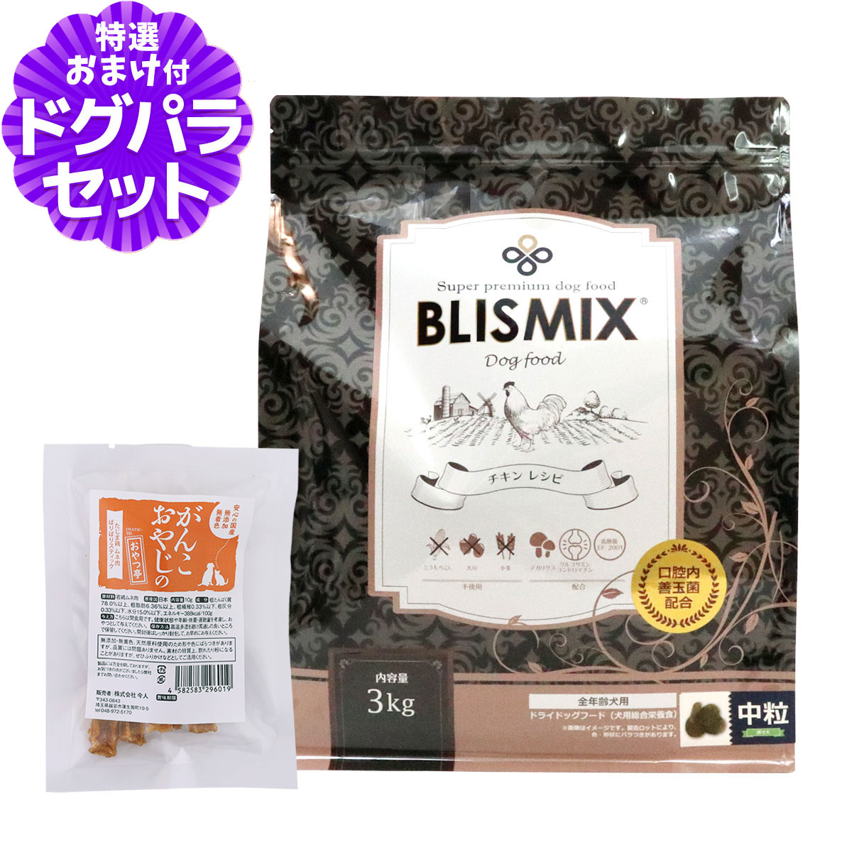 ブリスミックスの解説 ブリスミックスには冷凍の肉、野菜を使用していません。すべて冷蔵保存されたものなので、風味を損なわず余分な添加物や油で風味をごまかさなくても、高い嗜好性を保っています。なかなかごはんを食べてくれない愛犬にぜひ一度お試しください。ブリスミックスは、アレルギーの原因になりやすい肉副産物・人工保存料・着色料は使用していません。また犬が消化を苦手とするでんぷん質の多い、小麦・大豆・とうもろこしも不使用。愛犬に安心して与えて頂ける素材を人間の食品基準で厳選しています。 ブリスミックス ドッグ チキン 小粒・中粒の詳細 対象 全犬種/全年齢用 ブリスミックス ドッグ チキン 小粒・中粒について 従来のブリスミックス同様、お口の状態を整えてくれる 口腔内善玉菌K12を配合、さらにアガリクス茸・乳酸菌 EF2001・グルコサミン・コンドロイチンがプラスされています。チキンを主原材としたドッグフードです。K12は抗菌作用のあるタンパク質を作り出し、悪玉菌の繁殖を抑えることで口腔内の善玉菌、悪玉菌のバランスを整える役割を果たしています。口腔内の環境を整えてくれる口腔エキスパート善玉菌です。 ・K12(口腔内善玉菌)配合 ・フレッシュ素材の使用 ・原材料へのこだわり ・βグルカンを多く含むアガリクス茸 ・最高級乳酸菌EF2001乳酸菌配合 ・関節や軟骨の健康を守るグルコサミン・コンドロイチン配合 ・アレルギーの原因になりやすい肉副産物・人工保存料・着色料不使用 ・アレルギーが気になる愛犬に その他 本製品は犬用です。直射日光、高温多湿を避けて保存し、開封後は密封容器などをご使用いただき賞味期限に関わらずお早めにご使用ください。 ※当店の商品は全て正規品です。安心してお買い求めください。 ■パッケージ・内容成分などは予告なく変更になることがございます。ご了承くださいませ。 犬/ドッグフード/blismix/チキン/鶏/子犬/幼犬/パピー/成犬/老犬/シニア/アダルト/アレルギーが気になる/アガリクス/乳酸菌/善玉菌/関節/軟骨/ドライ/フード/ペットフード/ローテーション原材料 フレッシュチキン・ドライチキン・玄米・えんどう豆・えんどう豆粉・黍・鶏脂肪(混合トコフェロールによる保存処理)・トマト搾り粕(リコピン)・チキンスープ(天然風味料)・フラックスシード・サーモンオイル( DHA)・ジンジャー・塩・塩化コリン・乾燥チコリ根・ケルプ・人参・リンゴ・トマト・ブルーベリー・ほうれん草・クランベリー・ローズマリーエキス・パセリフレーク・グルコサミン塩酸塩・ユッカシジゲラエキス・アガリクス・ストレプトコッカス サリバリウス(口腔内善玉菌)・エンテロコッカスフェカリスEF2001・ラクトバチルスアシドフィルス・ビフィドバクテリウムアニマリス・ラクトバチルスロイテリ・ビタミンE・キレート鉄・キレート亜鉛・キレート銅・硫酸第一鉄・硫酸亜鉛・硫酸銅・コンドロイチン硫酸・ヨウ化カリウム・チアミン硝酸塩・キレートマンガン・酸化マンガン・ アスコルビン酸・ビタミンA・ビオチン・ナイアシン・パントテン酸カルシウム・硫酸マンガン・亜セレン酸ナトリウム・ピリドキシン塩酸塩・ビタミンB12・リボフラビン・ビタミンD3・葉酸 保証成分 粗タンパク質24.0%以上、粗脂肪12.0%以上、粗繊維4.5%以下、粗灰分5.5%以下、水分10.0%以下、オメガ6脂肪酸2.5%以上、オメガ3脂肪酸0.4%以上、マグネシウム0.12%以上、カルシウム1.2%以上、リン1.0%以上、ナトリウム0.3%以上、グルコサミン300mg/kg以上、コンドロイチン100mg/kg以上 カロリー 代謝カロリー 3,606kcal/kg 原産国 カナダ 対象年齢 全犬種/全年齢用 給与量目安 ご注意 本製品は犬用です。直射日光、高温多湿を避けて保存し、開封後は密封容器などをご使用いただき賞味期限に関わらずお早めにご使用ください。 商品についてのお知らせ ※パッケージ・内容成分などは予告なく変更になることがございます。 おすすめポイント