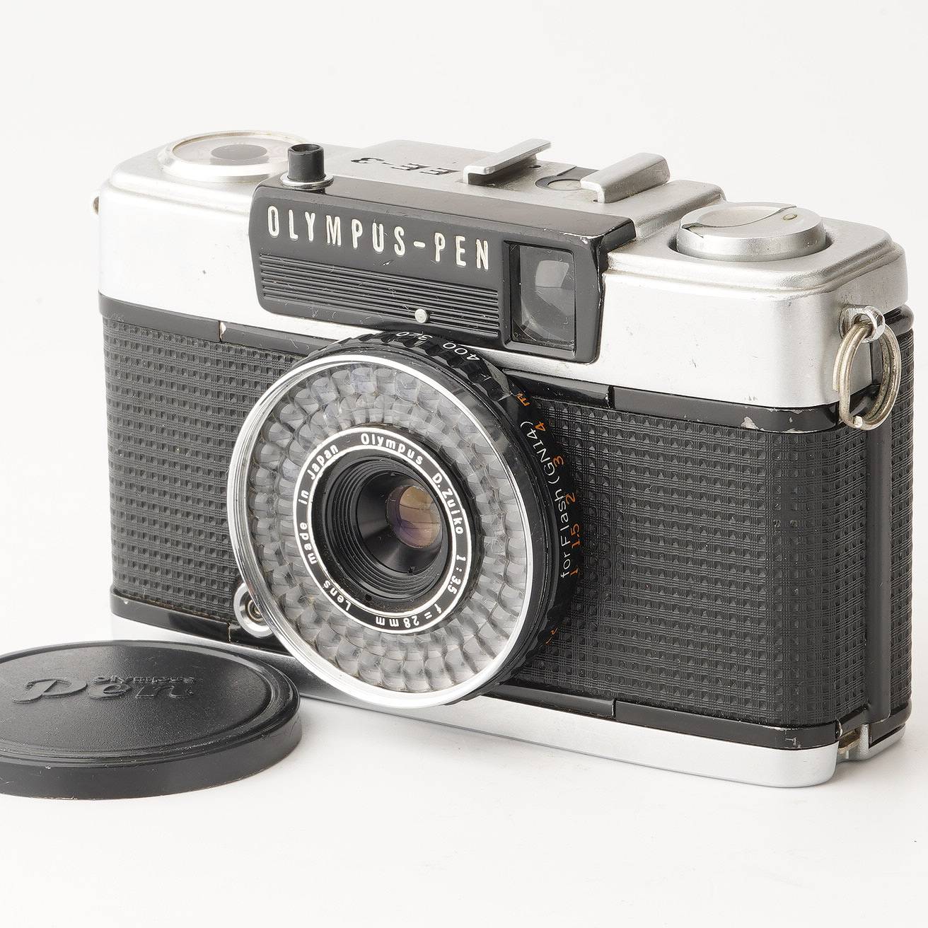 [OLYMPUS PEN EF] 50年以上前のハーフサイズのフィルムカメラです。 OLYMPUS PEN(オリンパス ペン)は、ハーフサイズカメラとして1959年に登場しました。 ハーフサイズによる小型軽量化、リヤワインディングによるシンプルな巻き上げ機構、高品質な描写力を持つDズイコーレンズ、美しく使いやすいデザイン。独創的な発想を凝縮したPENは、1960年代から70年代にかけて、ハーフサイズカメラの大ブームを引き起こしました。 PENシリーズの累計販売台数は、800万台を超えています。 オリンパスペンEFは、1981年発売のPENシリーズの最終モデルでフラッシュを搭載したモデルです。レンズはDズイコー28mm F3.5、ピントは固定焦点にしたカメラです。露出制御はセレン受光素子によるプログラム露出ですので、シャッターを押すだけで写真が撮れる、とってもカンタンなカメラです。 ※ハーフサイズカメラとは? ハーフサイズカメラとは、通常の35mmフィルムカメラの半分の画面サイズで、2倍の枚数撮れるカメラのことです。 ○特徴○<BR> ・とっても小さくレトロでかわいい外観! ・プログラムAEの自動露出制御と固定焦点で押すだけのカンタン撮影 ・フィルムは普通のフィルム(35mmフィルム)を使用します。 ↓この画像は実際にお送りするカメラの画像です。 [基本情報] 製品名:OLYMPUS PEN EF 形式: ハーフサイズカメラ シャッター: 1/30秒、1/250秒 プログラムシャッター レンズ: D.Zuiko 28mm F3.5(3群4枚) ピント合わせ: 固定焦点 露出計: 外光式 セレン受光素子 露出: プログラム露出のみ 発売年 1981年 大きさ:115(巾)×74(高)×44(厚)mm 重量:280g このカメラには単焦点レンズD.Zuiko 28mm F3.5が付いています。 Zuikoはオリンパスのレンズの名称です。 ハーフサイズなので、けっして高画質という訳ではありませんが、 写真の周辺が少し暗く映ったり、白いもやもや(フレアー)、ザラザラした画質など、 いかにもフィルム写真らしい描写がお楽しみいただけるカメラです。 [商品状態] コンディションランク A 美品 外観 小さなキズはありますが、全体的に美品です。画像でご確認ください。 光学系 ファインダー:カビ、クモリありません。 レンズ:カビ、クモリありません。 機能 各部確認の上、修理、調整済みです。 備考 作動保証 3か月間 ご購入後3か月以内に通常使用で壊れた場合は、 無償で修理または同等品と交換させていただきます。 ↓この画像は実際にお送りするカメラの画像です。 [セット内容] ・カメラ本体(USED) ・ハンドストラップ ・レンズキャップ ・単三電池×1本(カメラに入っています) ・カラーフィルム1本(種類は画像と違う場合があります) ・各種説明書(3冊) ・カメラケース(お好きな柄のケースをお付けします) [注意] ご注文前に画像をクリックして在庫の有無をご確認ください。 ※お選びいただいたカメラケースが欠品の場合、ご連絡の上、別の柄にご変更いただく場合がございます。 ※この商品は、ミーナ本店とミーナ楽天店で同時に販売しています。1点物のため販売が重複した場合、 在庫をご用意できない場合がございますので、あらかじめご了承ください。