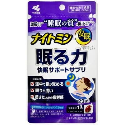 サプリメント/機能性表示食品※本品は、事業者の責任において特定の保健の目的が期待できる旨を表示するものとして、消費者庁長官に届出されたものです。ただし、特定保健用食品と異なり、消費者庁長官による個別審査を受けたものではありません。 ※本品は、疾病の診断、治療、予防を目的としたものではありません。 ※本品は、疾病に罹患している者、未成年者、妊産婦(妊娠を計画している者を含む。)及び授乳婦を対象に開発された食品ではありません。 ※疾病に罹患している場合は医師に、医薬品を服用している場合は医師、薬剤師に相談してください。 ※体調に異変を感じた際は、速やかに摂取を中止し、医師に相談してください。 【発売元、販売元又は製造元】 小林製薬株式会社 ※商品リニューアル等によりパッケージ及び容量等は変更となる場合があります。ご了承ください。【商品説明】 加齢などによる"睡眠の質"の低下が気になる方に 着色料、香料、保存料すべて無添加【召し上がり方】<1日当たりの摂取量の目安>1粒<食べ方>1日1粒を目安に、夕食後にかまずに水またはお湯とともにお召し上がりください。【原材料】ゼラチン(国内製造)、ビタミンE含有植物油、サフラワー油/グリセリン、ビタミンB2、クチナシ、ビタミンB1、グリセリン脂肪酸エステル、フィチン酸、ビタミンD【栄養成分】1日目安量(1粒)あたりエネルギー・・・1.9kcalたんぱく質・・・0.14g脂質・・・0.13g炭水化物・・・0.0081~0.081g食塩相当量・・・0~0.00011gビタミンB1・・・10.0mgビタミンB2・・・12.0mgビタミンD・・・20.0~71.0μgビタミンE・・・50.0mg 機能性関与成分クロセチン・・・7.5mg【製造国又は原産国】日本【法定製品カテゴリー】機能性表示食品<届出番号>F454<届出表示>本品には、クロセチンが含まれます。クロセチンは、良質な眠りをサポートする(中途覚醒回数を減らし、眠りをより深くし、起床時の眠気や疲労感を和らげる)ことが報告されています。加齢などによる睡眠の質の低下が気になる方に適しています。