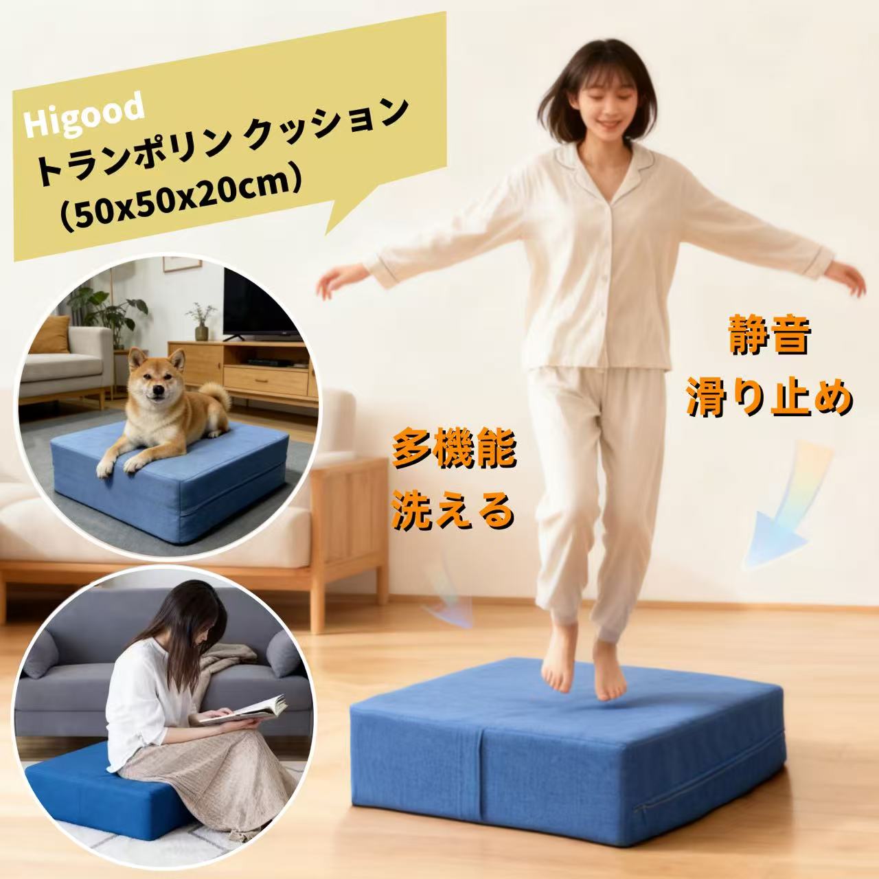 【高反発で静音】マンションでも安心のジャンプエクササイズ 人気の室内用トランポリンクッションです。独自の三重構造(高反発スポンジ+二重耐久ナイロン)により、優れた跳び心地を実現しながら、静音設計で床への衝撃音を大幅に低減。下の階への騒音を気にせず、自宅で思い切り有酸素運動が楽しめます。運動器具でありながら、使わない時はインテリアに溶け込むクッションとしてもご利用いただけ、一石二鳥の家庭用アイテムです。 【大人から子供まで】家族全員で使えるダイエット&運動マット 大人のダイエットやトレーニングはもちろん、子供用の遊び道具としても安全です。高反発素材が関節への負担を軽減するため、運動習慣のない方や高齢者の軽いリハビリ、バランス運動にも最適。ストレス発散や運動不足解消に、家族みんなで楽しくジャンプしましょう。 【組み立て不要で省スペース】収納ラクな四角型設計、洗えるカバーで清潔 面倒な組み立て不要で、開封後すぐにお使いいただけます。従来の丸型より省スペースな四角型(50cm四方)なので、狭いお部屋でも置き場所に困りません。外カバーは簡単に取り外し可能で、水洗いできるため、汗や汚れを気にせず清潔を保てます。持ち手付きで移動・収納も楽々です。 【滑り止め付きで安定】安全設計のジャンプクッションで効果的なエクササイズ 底面には滑り止め加工を施し、跳んでいる時のずれや転倒を防止。二重ナイロンにより、安定した反発力で効果的な全身運動をサポートします。体幹を鍛え、全身の引き締めや基礎代謝アップに効果的。おうち時間を活用した効率的なフィットネスを実現します。 【ストレス解消に最適】お手軽なホームジムで、楽しく続けられる健康器具 天候や時間に左右されず、室内で気軽にできる運動グッズです。単調な運動になりがちな自宅トレーニングも、このトランポリンクッションなら楽しく続けられます。仕事の合間の気分転換や、夜のリラックスにもぴったり。健康器具として、あなたの毎日の活力と健やかな生活を応援します。 商品仕様 サイズ:幅50cm × 奥行き50cm × 高さ20cm カラー:ブルー 素材:ポリエステル、スポンジ、ナイロン お手入れ:外カバー手洗い可能