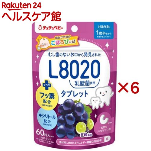 お店TOP>健康食品>子供用サプリメント>乳幼児用サプリメント>チュチュベビー L8020乳酸菌入タブレット 巨峰風味 (60粒入×6セット)【チュチュベビー L8020乳酸菌入タブレット 巨峰風味の商品詳細】●L8020乳酸菌配合●1日2粒を目安に、口の中でゆっくり溶かしてお召し上がりください●60粒入(約30日分)●口内に成分を長く留めるB-MoG配合●巨峰風味【召し上がり方】・1日2粒を目安に食後のおやつや、歯みがき後等にお召し上がりください。・噛まずに口の中でゆっくり溶かしてください。(飲み込んだり噛んだりしないでください)・お子様がまだ慣れないうちは、すり潰すか小さく割ってから与えてください。・就寝30分前までに食べ終わるようにしてください。【品名・名称】乳酸菌加工食品【チュチュベビー L8020乳酸菌入タブレット 巨峰風味の原材料】還元麦芽糖水飴(国内製造)、発酵乳粉末(L8020乳酸菌含有)、エリスリトール、ぶどう果汁パウダー/増粘剤(カラギナン)、HPMC、香料、クエン酸、二酸化ケイ素、ステアリン酸Ca、甘味料(キシリトール、ステビア)、緑茶抽出物、(一部に乳成分を含む)【栄養成分】2粒(700mg)あたりエネルギー:2.7kcal、たんぱく質:0.03g、脂質:0.03g、炭水化物:0.59g(糖類:0.03g)、食塩相当量:0.005g【アレルギー物質】乳【保存方法】直射日光や高温多湿のところを避けて保存してください。【注意事項】・1歳半頃、奥歯が生えるまでは、与えないこと。また、食べ終わるまでは、保護者がそばに付き添い目を離さないこと。のどに詰まらないよう注意するためです。・食品によるアレルギーのある方、または治療を受けている方は、原材料名を確認し、医師と相談の上、お召し上がりください。本品は「乳」を含みます。・体質や体調により、まれに合わない場合があります。その場合は、摂取を中止してください。・一度に多量に摂取すると、体質によりお腹がゆるくなることがあります。・開封後は、湿気が入らないようジッパーをしっかり閉めて、早めにお召し上がりください。・濡れた手で触れた粒は、元の袋に戻さないでください。・乾燥剤が入っていますので、誤って口に入れないようご注意ください。・歯垢や食べ残しの除去には、歯ブラシによるブラッシングが必要です。・大人の方でもお召し上がりいただけます。歯みがき後がおすすめです。・乳幼児の手の届かない所に保管してください。・ペットなど動物に与えないでください。・割れ、欠けがありますが、品質に問題はございません。・タブレットの色が変わる場合がありますが、品質に問題はございません。・タブレットの茶色いつぶつぶは原料由来のものですので、安心してお召し上がりいただけます。・月齢は目安です。お子様の食べる様子を見ながら与えてください。【原産国】日本【ブランド】チュチュベビー【発売元、製造元、輸入元又は販売元】ジェクス※説明文は単品の内容です。リニューアルに伴い、パッケージ・内容等予告なく変更する場合がございます。予めご了承ください。・単品JAN:4973210995922ジェクス540-0012 大阪市中央区谷町2-3-12 マルイト谷町ビル11階06-6942-4416広告文責:楽天グループ株式会社電話:050-5577-5042[デンタルリンス マウスウォッシュ/ブランド:チュチュベビー/]