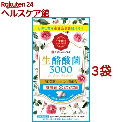 お店TOP>健康食品>酵素・酵母・乳酸菌類>その他細菌類>酪酸菌(宮入菌)>ミナミヘルシーフーズ 生酪酸菌3000 (60カプセル*3袋セット)【ミナミヘルシーフーズ 生酪酸菌3000の商品詳細】●短鎖脂肪酸を増やす「生きた酪酸菌」を3000万個*配合。*2カプセル中(1日摂取目安量)●有用菌●生きた酪酸菌とビフィズス菌。【召し上がり方】栄養補助食品として、1日当たり2カプセル程度を目安にそのまま水またはぬるま湯と一緒にお召し上がりください。【品名・名称】酪酸菌、ビフィズス菌含有食品【ミナミヘルシーフーズ 生酪酸菌3000の原材料】酪酸菌末(コーンスターチ、酪酸菌、乳糖)(国内製造)、ビフィズス菌乾燥粉末(澱粉、ビフィズス菌乾燥原末)/結晶セルロース、HPMC、ステアリン酸カルシウム、(一部に乳成分・大豆を含む)【栄養成分】2カプセル(0.412g)当たり熱量:1.56kcal、たんぱく質:0g、脂質:0g、炭水化物:0.39g、食塩相当量:0.0003g酪酸菌末:3000万個、ビフィズス菌:30億個【規格概要】内容量:12.36g(160mg(1カプセル重量206mg)*60カプセル)【保存方法】高温多湿、直射日光を避けて保存してください。【注意事項】・ご使用前に表示及び説明文をよくお読みの上正しくお使いください。・開封後は開封口をしっかり閉めて保存し、なるべく早くお召し上がりください。・ソフトインカプセルになっておりますので、カプセルどうしでくっついてしまう場合がありますが、スプーンなどでかきまぜていただきますと簡単に離れます。・内容物が分離、沈殿あるいは結晶化することがありますが、品質には問題ありません。・まれに体質に合わない方もございます。ご使用後体調のすぐれない場合は一時使用を中止してください。・幼児の手の届かない所に保管してください。・原材料をご確認の上、食物アレルギーのある方はお避けください。・妊娠中・授乳中の方、薬を服用中または通院中の方は、念のため医師にご相談ください。・乾燥剤は食べられませんのでご注意ください。・本品は、製造ロットにより色調などが異なる場合がございますが、品質には問題ございませんので、安心してお召し上がりください。【原産国】日本【ブランド】ミナミヘルシーフーズ【発売元、製造元、輸入元又は販売元】ミナミヘルシーフーズ※説明文は単品の内容です。リニューアルに伴い、パッケージ・内容等予告なく変更する場合がございます。予めご了承ください。・単品JAN:4945904019047ミナミヘルシーフーズ360-0000 埼玉県熊谷市新掘1036-1048-533-7360広告文責:楽天グループ株式会社電話:050-5577-5043[乳酸菌サプリメント/ブランド:ミナミヘルシーフーズ/]