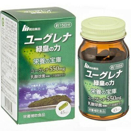 お店TOP>健康食品>動物由来サプリメント>動物由来>ユーグレナ(ミドリムシ)>ユーグレナ緑皇の力 (45粒)【ユーグレナ緑皇の力の商品詳細】●ユーグレナに乳酸菌約1000億個相当。15日分【召し上がり方】・食品として、1日に3粒程度を目安に水などでお召し上がりください。【品名・名称】ユーグレナ緑皇の力グラリシス含有加工食品【ユーグレナ緑皇の力の原材料】ユーグレナグラシリス(国産)、食物繊維、乳酸球菌(殺菌)(乳成分を含む)、デキストリン/ゼラチン、ステアリン酸Ca【栄養成分】1日目安量:3粒1.275mg当たりエネルギー:3.9kcal、たんぱく質:0.41g、脂質:0.11g、糖質:0.012g、食物繊維:0.65g、ナトリウム:3.0mg、ユーグレナグラシリス:550mg乳酸球菌(殺菌):約1000億個相当【アレルギー物質】乳・かに・ゼラチン・【保存方法】直射日光、高温多湿を避けて保存してください。【注意事項】・アレルギーのある方は原材料を確認してください。・体の異常や治療中、妊娠・授乳中の方は医師に相談してください。・子供の手の届かない所に保管してください。・開栓後は栓をしっかり閉めてお早めにお召し上がりください。・直射日光、高温多湿を避けて保存してください【原産国】日本【ブランド】ユーグレナ【発売元、製造元、輸入元又は販売元】明治薬品リニューアルに伴い、パッケージ・内容等予告なく変更する場合がございます。予めご了承ください。明治薬品101-0021 東京都千代田区外神田4丁目11番3号03-3253-3451広告文責:楽天グループ株式会社電話:050-5577-5043[ビューティーサプリメント/ブランド:ユーグレナ/]